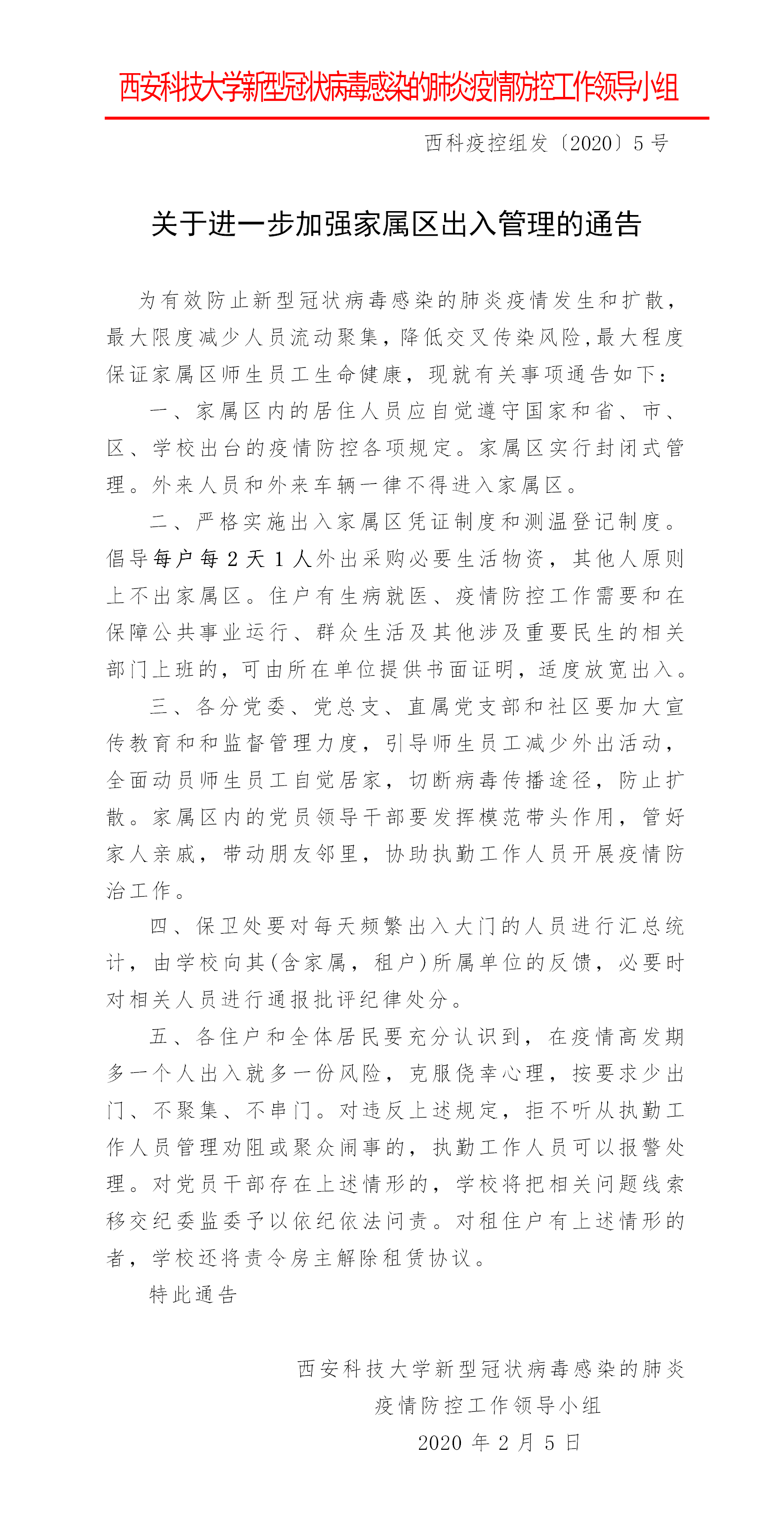 关于加强家属区出入管理的通告(西科疫控组5号)