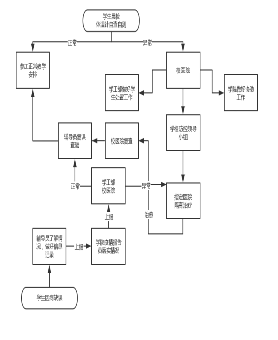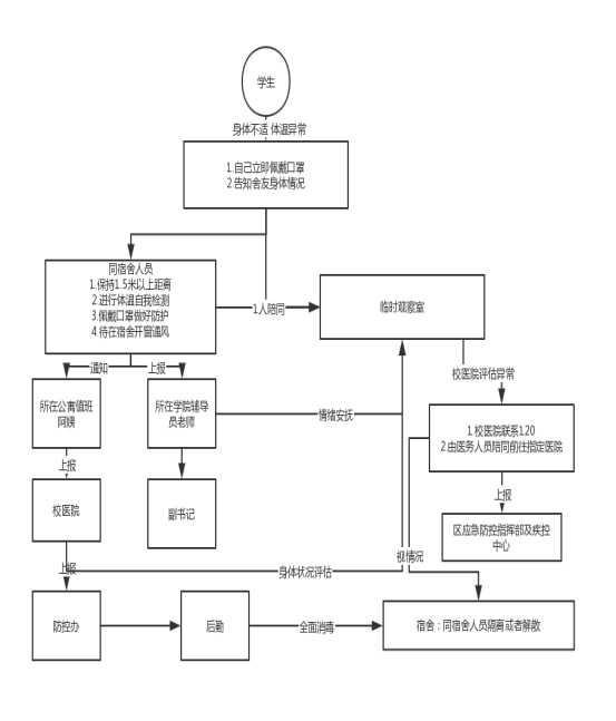 2.实施健康监测。进入宿舍前测量体温,体温异常学生到就近临时隔离场所,宿管人员须立即向辅导员和校医院刘曦18629339730报告,由校医院接诊医生根据学生体温及症状诊断并分类处置。