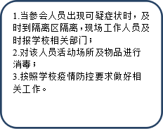 1.实行教职工健康状况自我检测晨午检制度。如教职工在家出现发热、乏力、干咳、呼吸困难、恶心呕吐、腹泻、结膜炎、肌肉酸痛等可疑症状,不要带病上班,向所在单位负责人汇报后可暂不到校,及时就医。在校若出现有发热、咳嗽等不适症状的,及时报告并就诊。